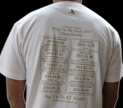 会場で発売されたHITH2011CHAMPIONSHIP TEEが数量限定で店頭&WEB販売開始です。 フロントにはCHAMPIONSHIPにふさわしい贅沢なゴールドを使用し、王冠とHITHロゴ、バスケットボールが一際目立つデザインになっています。バックプリントはHITH2010〜2011SEASONのスケジュールに各会場のネームが掲載されています。その下には「BIG UP TO ALL HOODS」の文字、つまり「全ての地元に感謝」という意味合いが込められています。